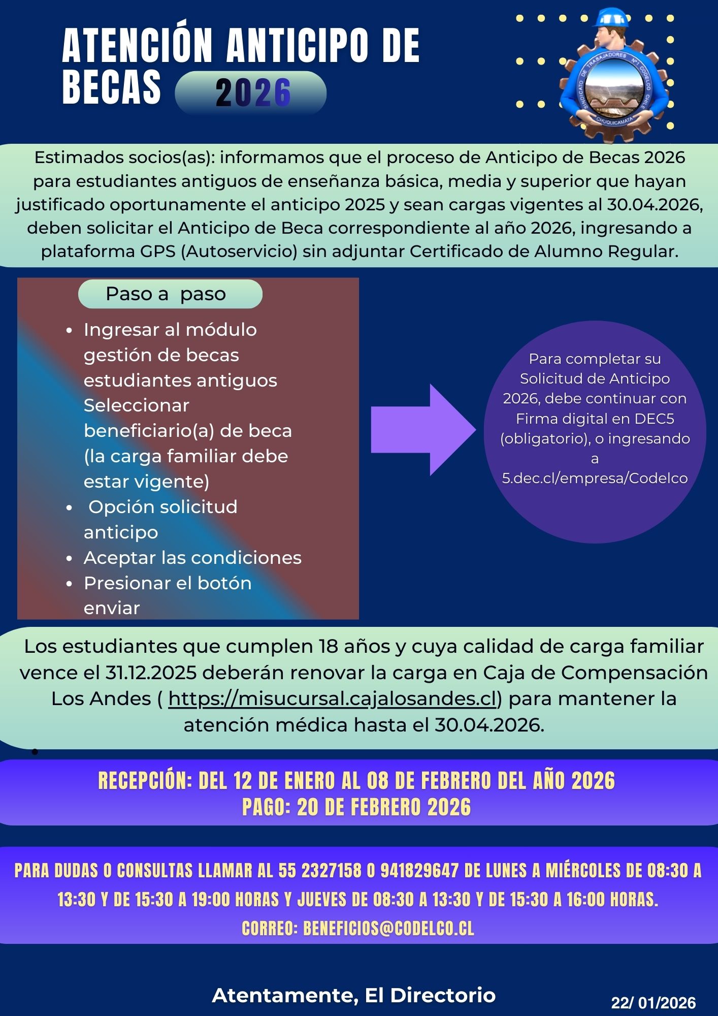 Te damos la posibilidad de desarrollarte académicamente, para ello entregamos aportes para Carreras Universitarias, Técnicas, Diplomados y Magister. Para acceder solo tienes que presentar el Certificado de Alumno regular que indique el semestre que cursas y el total de la carrera. Infórmate al 552 848658